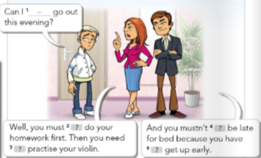 Учителят: Когато искаме да представим урок за позволение и задължение, както в следния пример: Can I go out this evening? (учителят записва изречението на дъската и кара учениците да го повторят) Или Well you must do your homework first. Then you must practice your violine. И And you mustn’t be late for bed because you need to get up early in the morning. Всичко казано е за взимане или даване на позволение или заявяване на задължение. Трябва да се знае, че модалните глаголи в българския език нямат същите правила, а имено, че: изискат смисловият глагол да е в инфинитивна форма, нямат окончания за род и число, което на български език е различно.