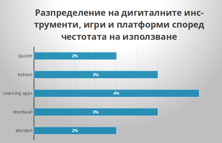 Фиг. 1. Разпределение на дигиталните инструменти, игри и платформи според честотата на използване